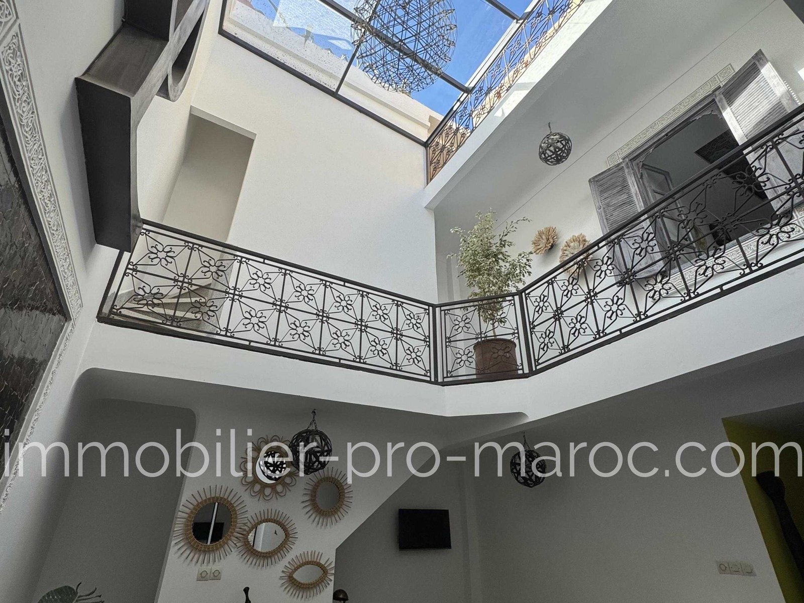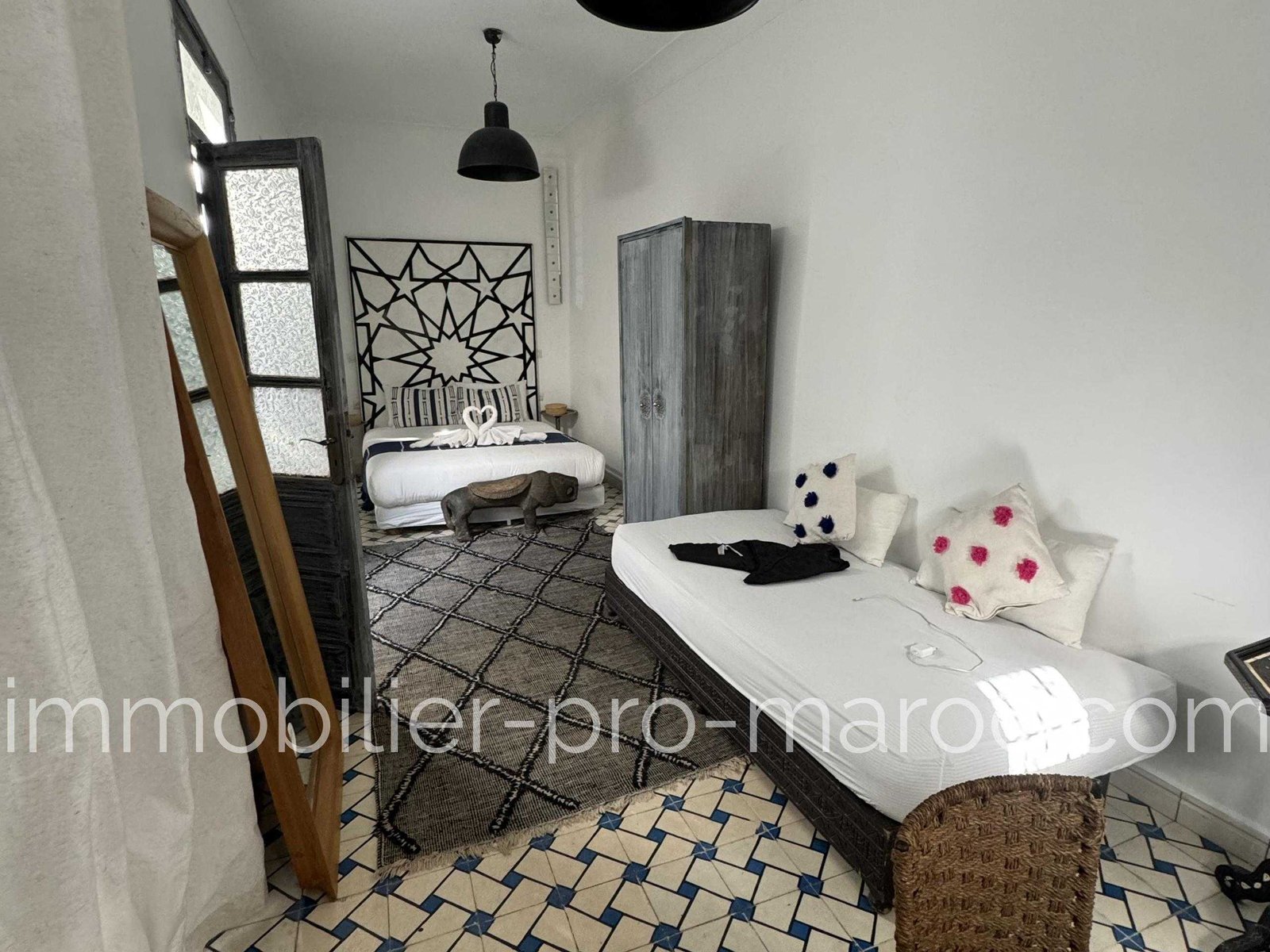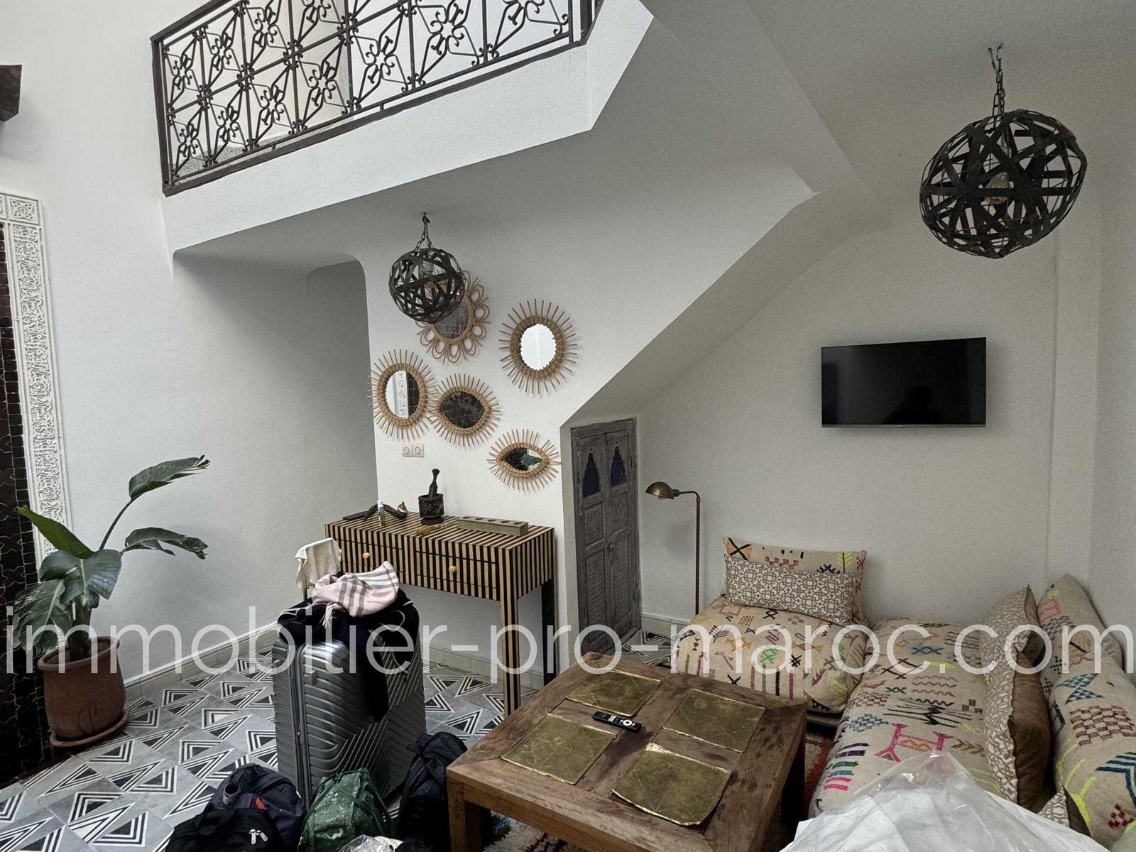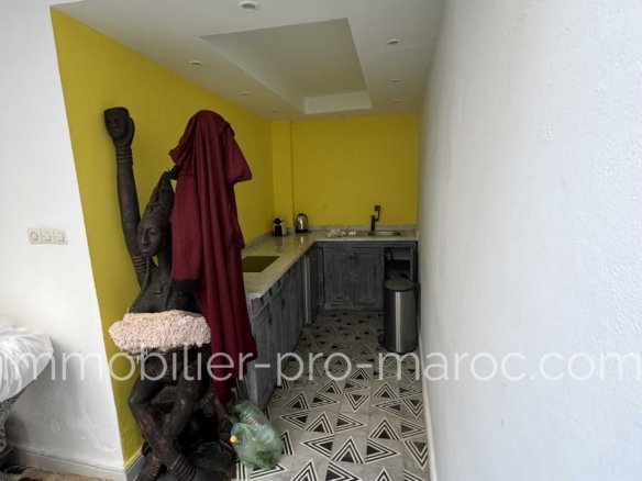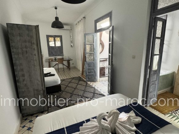 Nous vous proposons cette charmante Douria dans le quartier touristique de Ryad Laarouss à 10 mn de la place Jemaa El Fna. Ce bien est en statut juridique TITRÉ. Composition: RDC: petite entrée, patio avec verrière coulissante et fontaine (salon/salle à manger), cuisine ouverte et toilettes invités. 1er étage: une chambre quadruple (2 lits doubles) et une belle salle de bain avec baignoire. Terrasse: seconde chambre avec salle d’eau, coin détente et sur-terrasse avec bains de soleil. Le Riad est vendu entièrement meublé et équipé, produit idéal pour location courte durée type Airbnb.