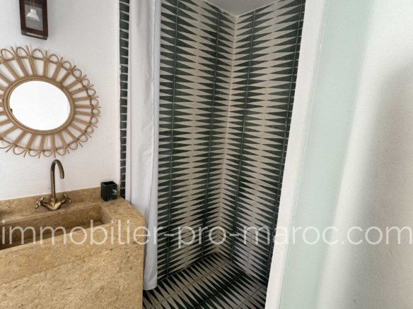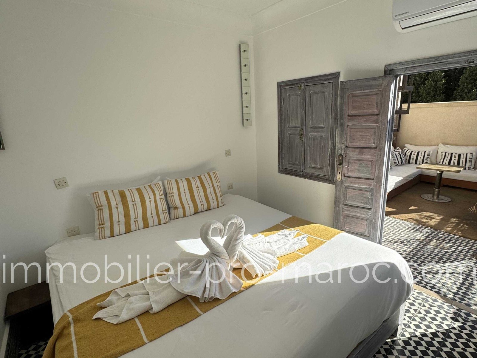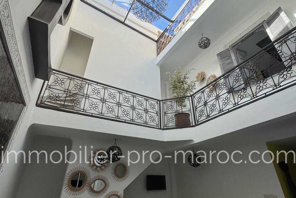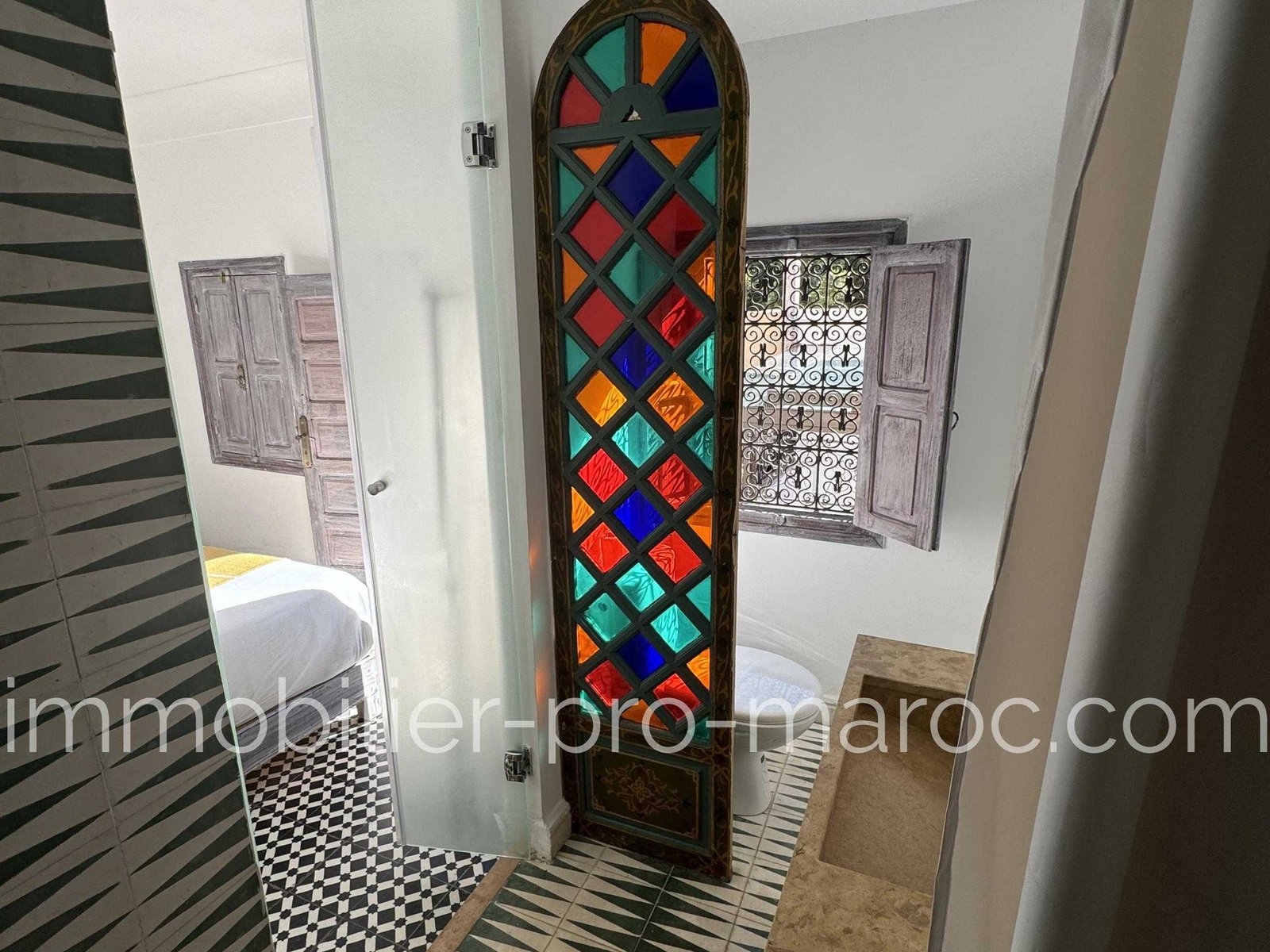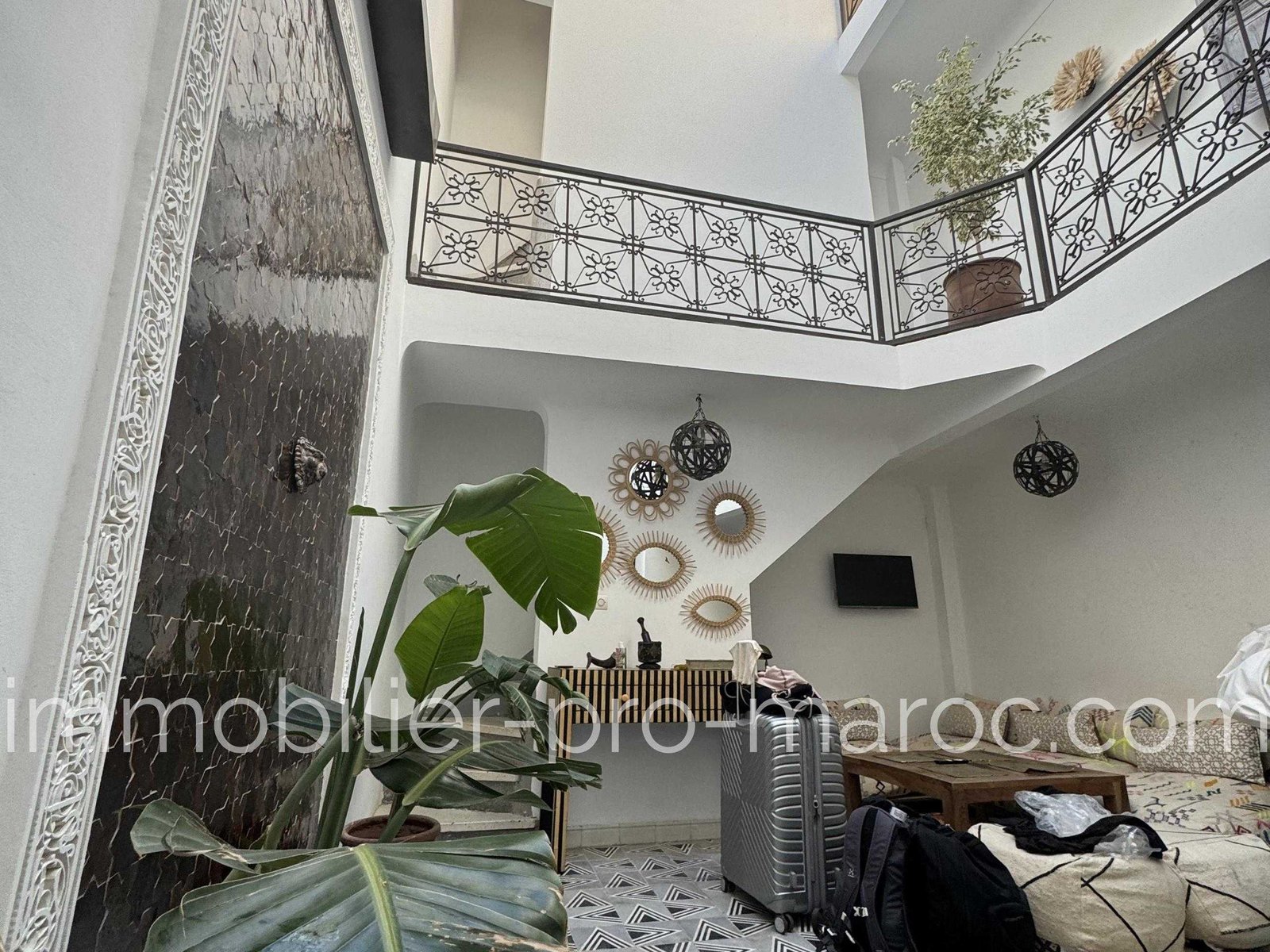Nous vous proposons cette charmante Douria dans le quartier touristique de Ryad Laarouss à 10 mn de la place Jemaa El Fna. Ce bien est en statut juridique TITRÉ. Composition: RDC: petite entrée, patio avec verrière coulissante et fontaine (salon/salle à manger), cuisine ouverte et toilettes invités. 1er étage: une chambre quadruple (2 lits doubles) et une belle salle de bain avec baignoire. Terrasse: seconde chambre avec salle d’eau, coin détente et sur-terrasse avec bains de soleil. Le Riad est vendu entièrement meublé et équipé, produit idéal pour location courte durée type Airbnb.